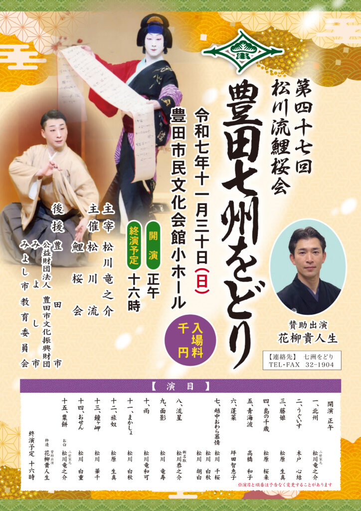松川流鯉桜会による第47回公演「豊田七州をどり」は、古典舞踊を中心に日本の美をお届けする年に一度の舞台です。地元ゆかりの出演者による華やかな演目が多数披露され、ご家族でお楽しみいただける公演となっております。